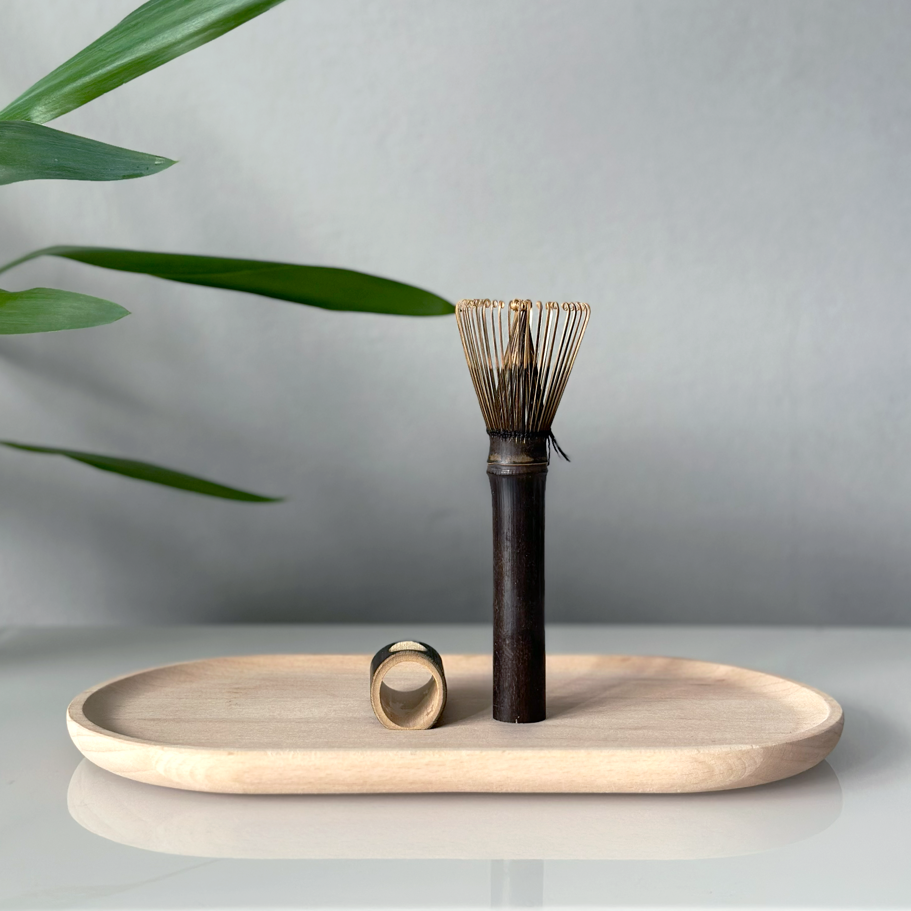 Oproti klasické bambusové metličce je tato o něco menší s dělší rukojetí. To zajišťuje, že se s metličkou lépe manipuluje a snadněji vyšlehá matchu i v menších miskách. Jelikož je metlička menší, dodává se společně s bambusovým stojánkem, který ji podpírá, aby při sušení neležela na štětinkách. Navíc stojínek slouží jako krásná doplněk a ladí k přírodnímu stylu metličky.